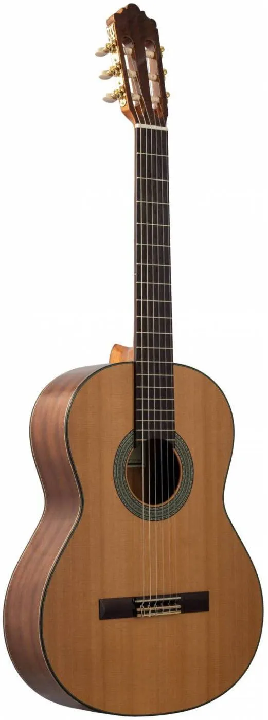 Altamira N200+ — отличная гитара для студентов музыкальных училищ, и для продолжающих изучать классическую гитару на продвинутом уровне. Верхняя дека из цельного красного кедра, нижняя дека и обечайка из красного дерева, гриф из африканского красного дерева, накладка на гриф и бридж из палисандра. Глянцевая отделка. Инструмент выполнен вручную, у него хорошая глубина баса, громкий и теплый, полный тон с довольно приличной чистотой.