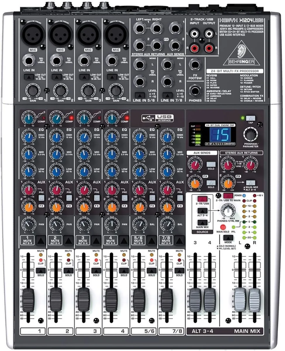 • 12-канальный микшерный пульт с USB интерфейсом и процессором эффектов
