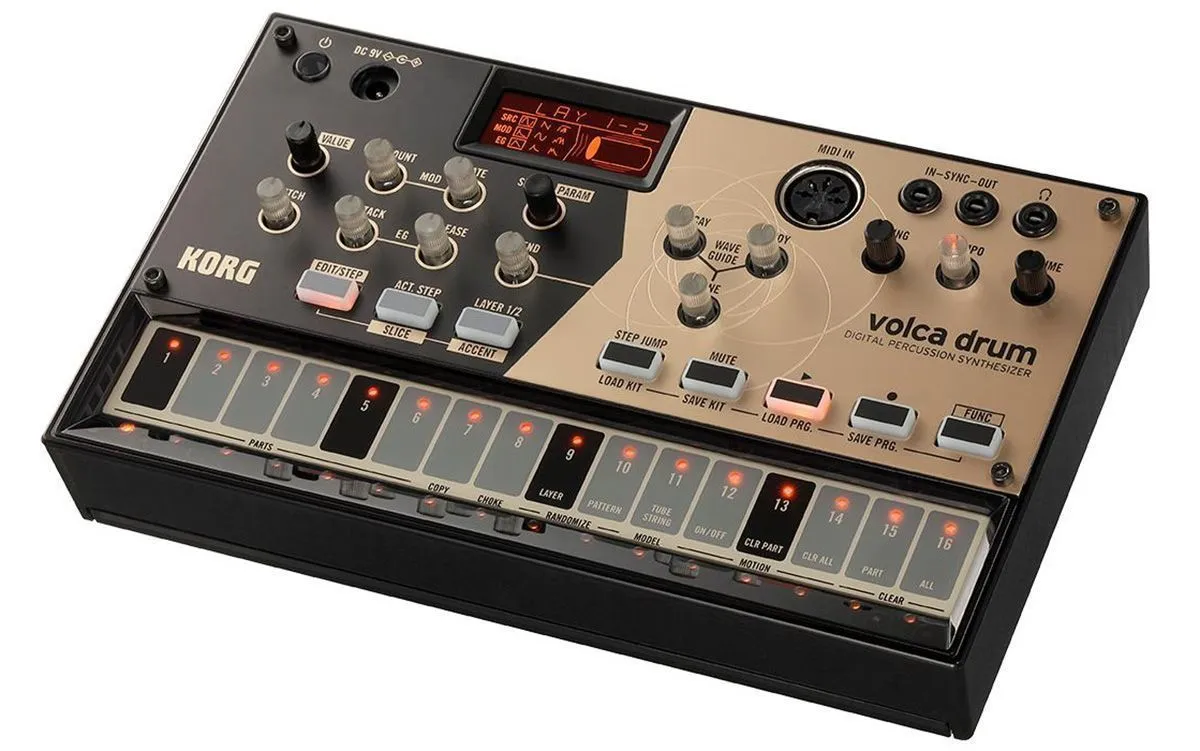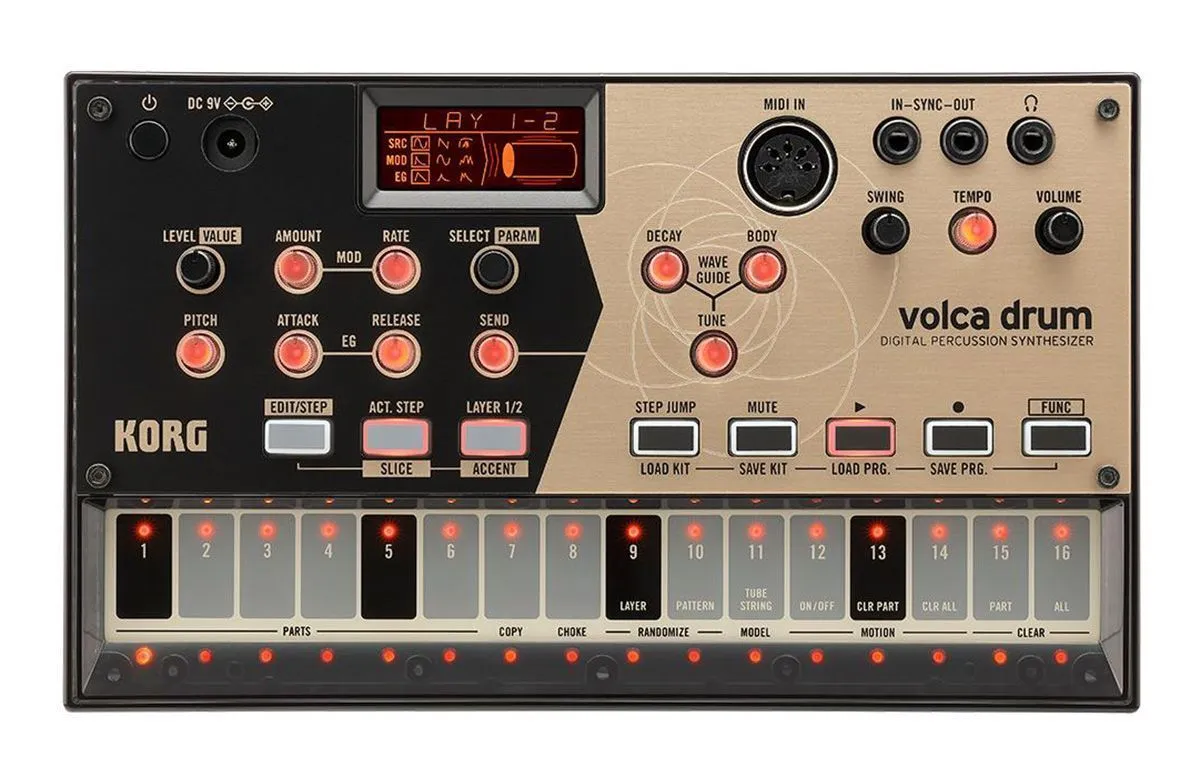 Korg Volca Drum – цифровой синтезатор ритм-машина из линейки Volca от знаменитого японского производителя. Как и все продукты серии, этот барабанный синтезатор позволяет получить уникальное звучание и обладает удобным, интуитивно понятным интерфейсом. Звуки ударных формируются с помощью аналогового моделирования на основе DSP. Доступны такие формы волны как синусоида, пила, а также шумы. Видоизменяя форму волны можно создать широкий спектр вариантов барабанного звука, от реалистичных и естественных до очень специфических. Каждая из шести частей синтезатора использует два осциллятора и позволяет использовать два слоя, характеристики всех частей одинаковы, так что им можно назначать любые типы звуков. Движок синтезатора VOLCA DRUM существенно отличается от классических драммашин и позволяет получить широкий спектр необычных и разнообразных вариантов звучания. Можно также проигрывать звуки с использованием секвенсора Volca. Дополнение ритмов такими уникальными звуками позволяет радикально изменить музыкальный материал при записи или исполнении. Возможности коммутации предусматривают разъемы Sync In и Out, MIDI In и выход для подключения наушников.